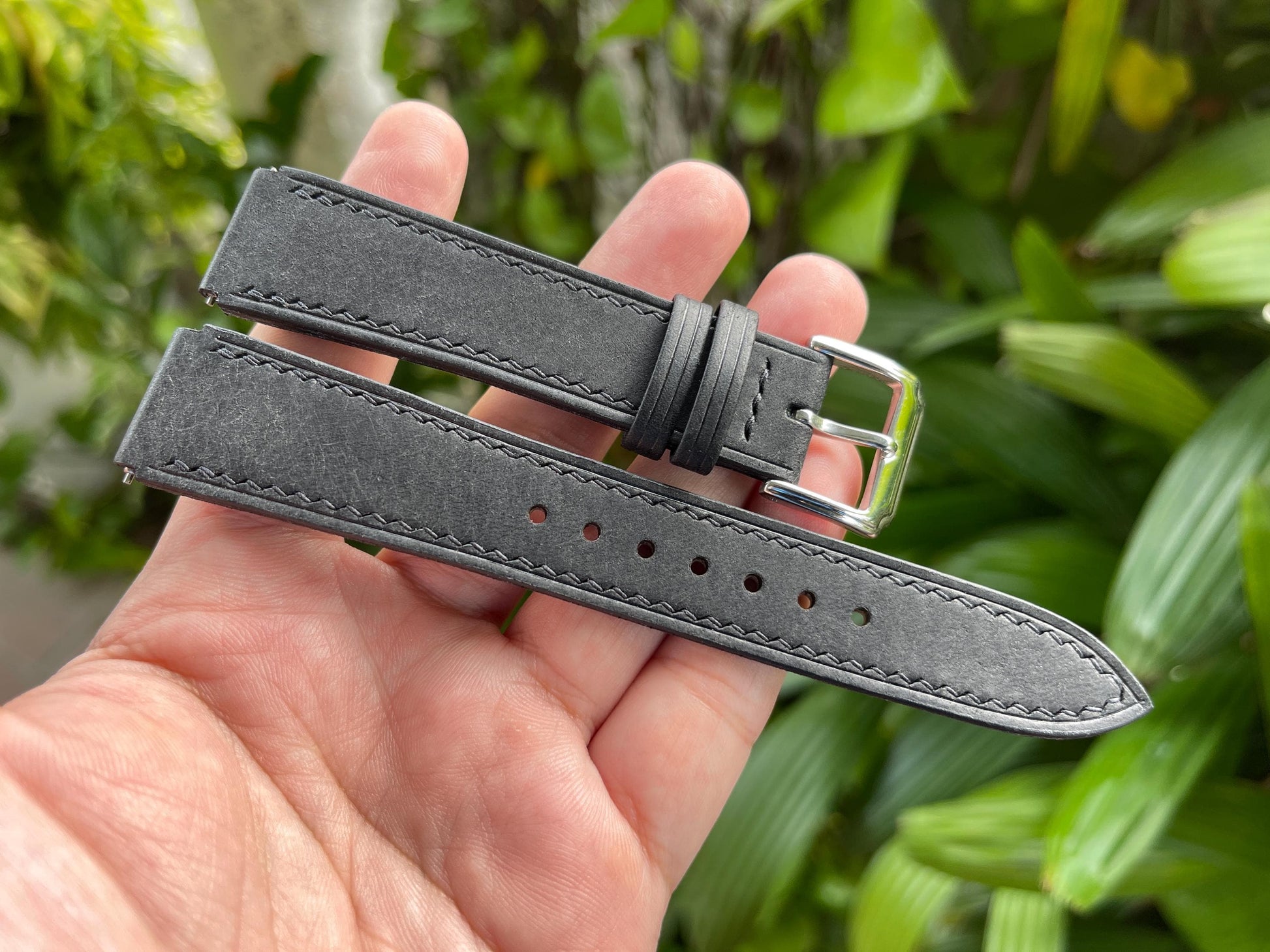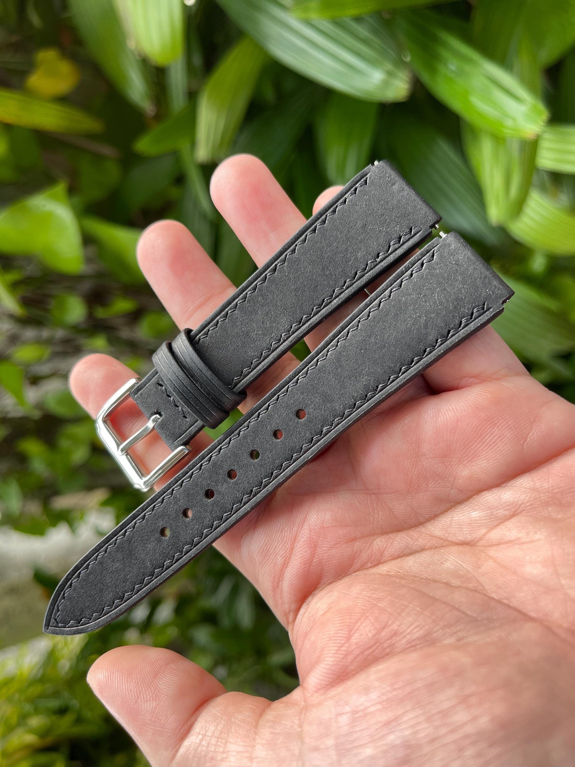 The bottom layer is Haas Zermatt-the specific calf leather for watch straps lining. This Zermatt is selected from good parts of a hide (not the Zermatt scraps or leftovers). In the middle there are 2-4 layers of filler that create nice shape and add anti-stretch ability to the product. The strap is hand-stitched with Meisi linen thread. You can believe in the durability of this product. As a craftsman I always find high quality materials for all things I make, never think of using cheap and low-quality things to save money and increase profits. The leather I use has a brand name to call, I don't have things that are unclear such as "genuine leather", "real leather"...