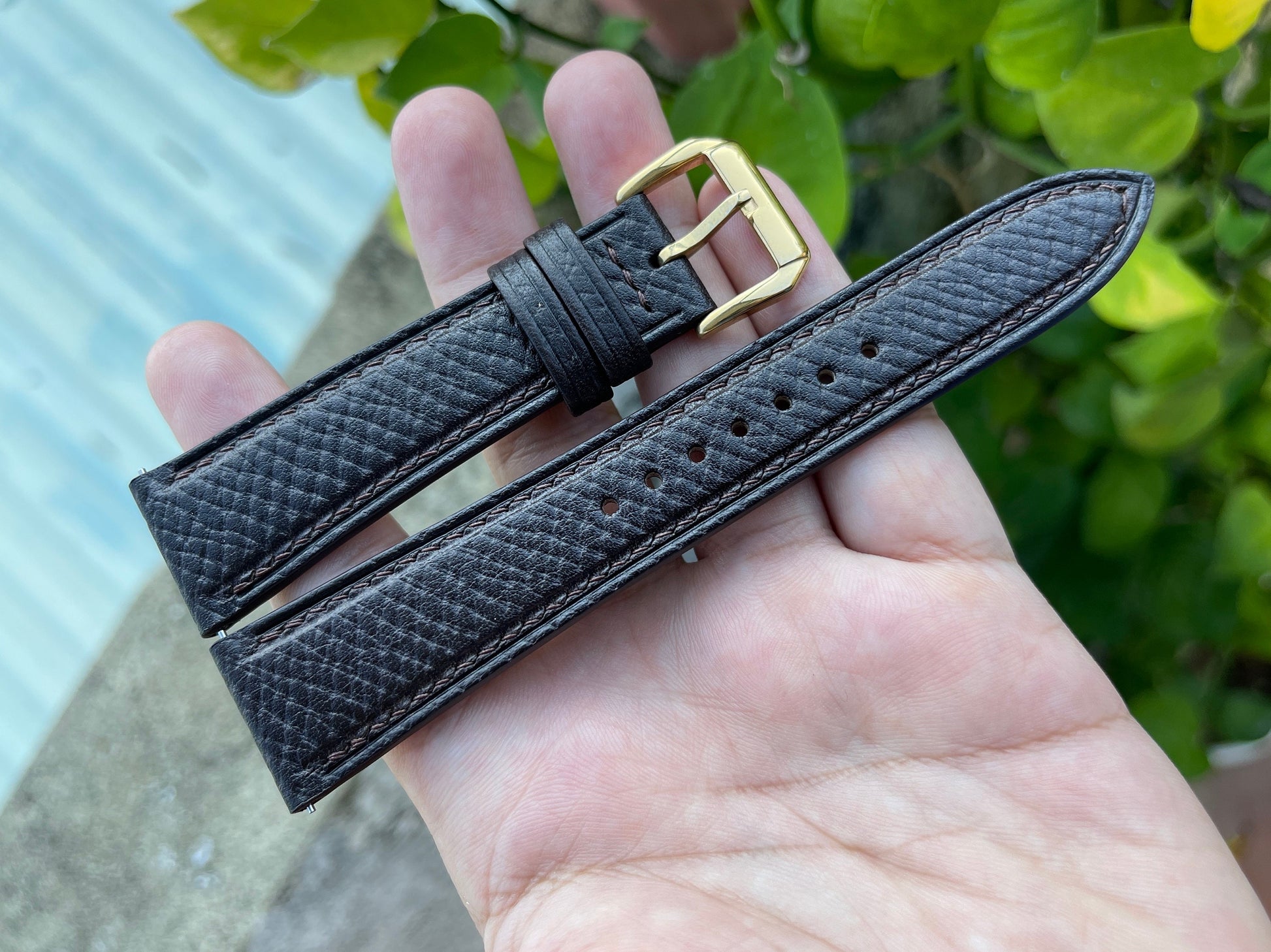 + Luxurious materials: This watch strap has 5 layers of materials. The top layer is Horween Russian Hatch Grain leather. Horween of Chicago is a brand name that guarantees quality and Russian Hatch Grain is one of the finest leathers in the world. It has been used by leather workers around the globe to make their bespoke shoes and other leather goods. The bottom layer is Haas Zermatt-the specific calf leather for watch straps lining. This Zermatt is selected from good parts of a hide (not the Zermatt scraps or leftovers). And in the middle, there are 3 layers of filler that create nice shape and add anti-stretch ability to the product. The strap is saddle stitched with Meisi linen thread. You can believe in the durability of this product. As a craftsman I always find high quality materials for all things I make, never think of using cheap and low-quality things to save money and increase profits. The leather I use has a brand name to call, I don't have things that are unclear such as "genuine leather", "real leather"...