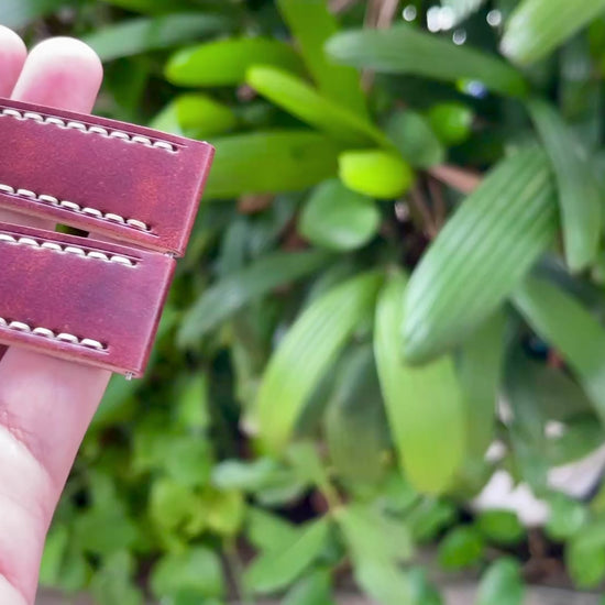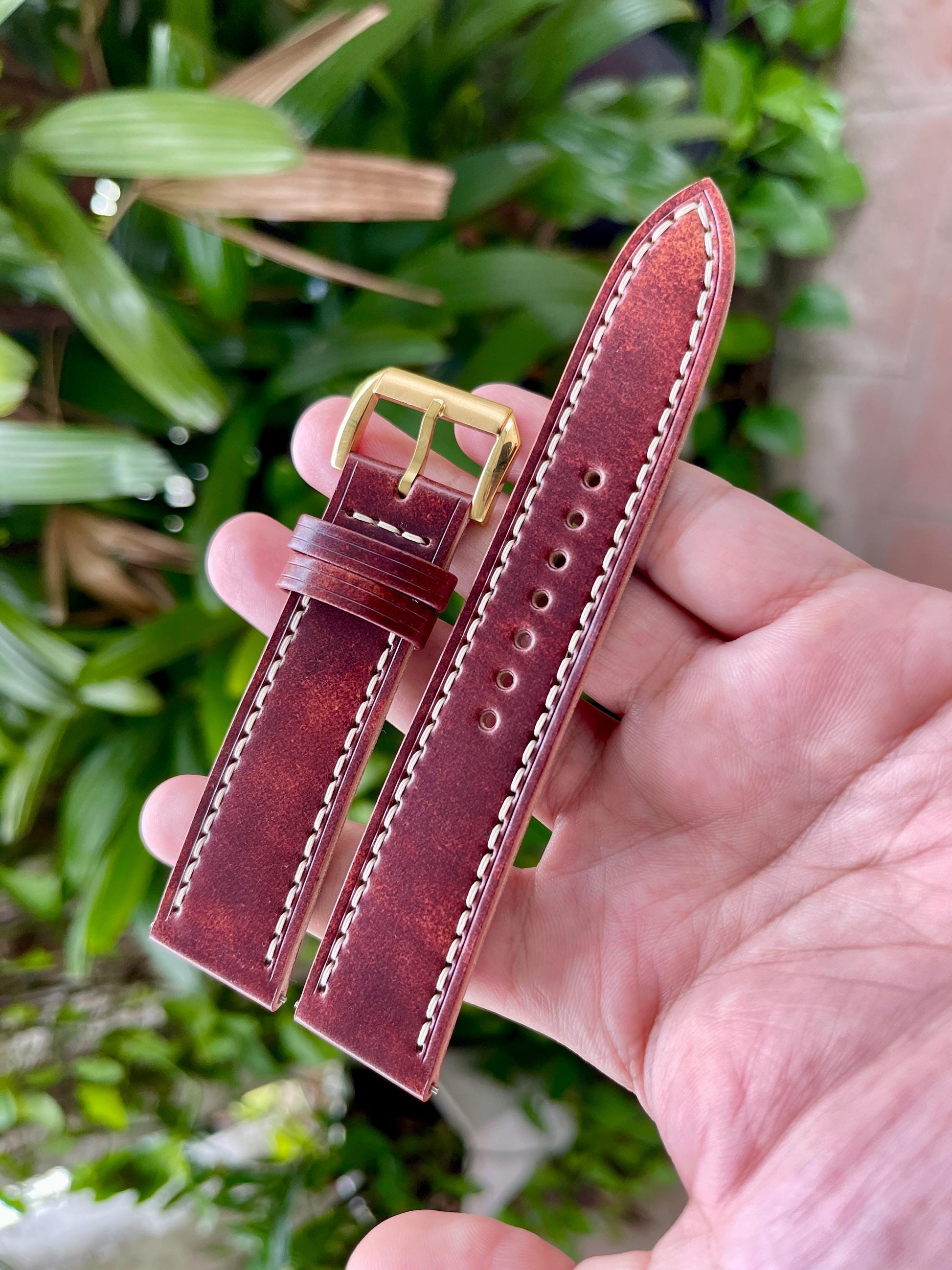 + Luxurious materials: This watch strap has 4-6 layers of materials. The top layer is Shell Cordovan-an equine leather famous for its durability, self-polishing character, deep color, smooth feel, and bright luster. It is one of the most precious leathers in the world. The leather comes from two areas on the underside of a horses rump where there is a dense flat muscle tissue. Shell cordovan is vegetable tanned using natural tannins from tree bark, chestnuts and leaves... The bottom layer is Haas Zermatt-the specific calf leather for watch straps lining. This Zermatt is selected from good parts of a hide (not the Zermatt scraps or leftovers). In the middle there are 2-4 layers of filler that create nice shape and add anti-stretch ability to the product. The strap is hand-stitched with Meisi linen thread. You can believe in the durability of this product. As a craftsman I always find high quality materials for all things I make, never think of using cheap and low-quality things to save money and increase profits. The leather I use has a brand name to call, I don't have things that are unclear such as "genuine leather", "real leather"...