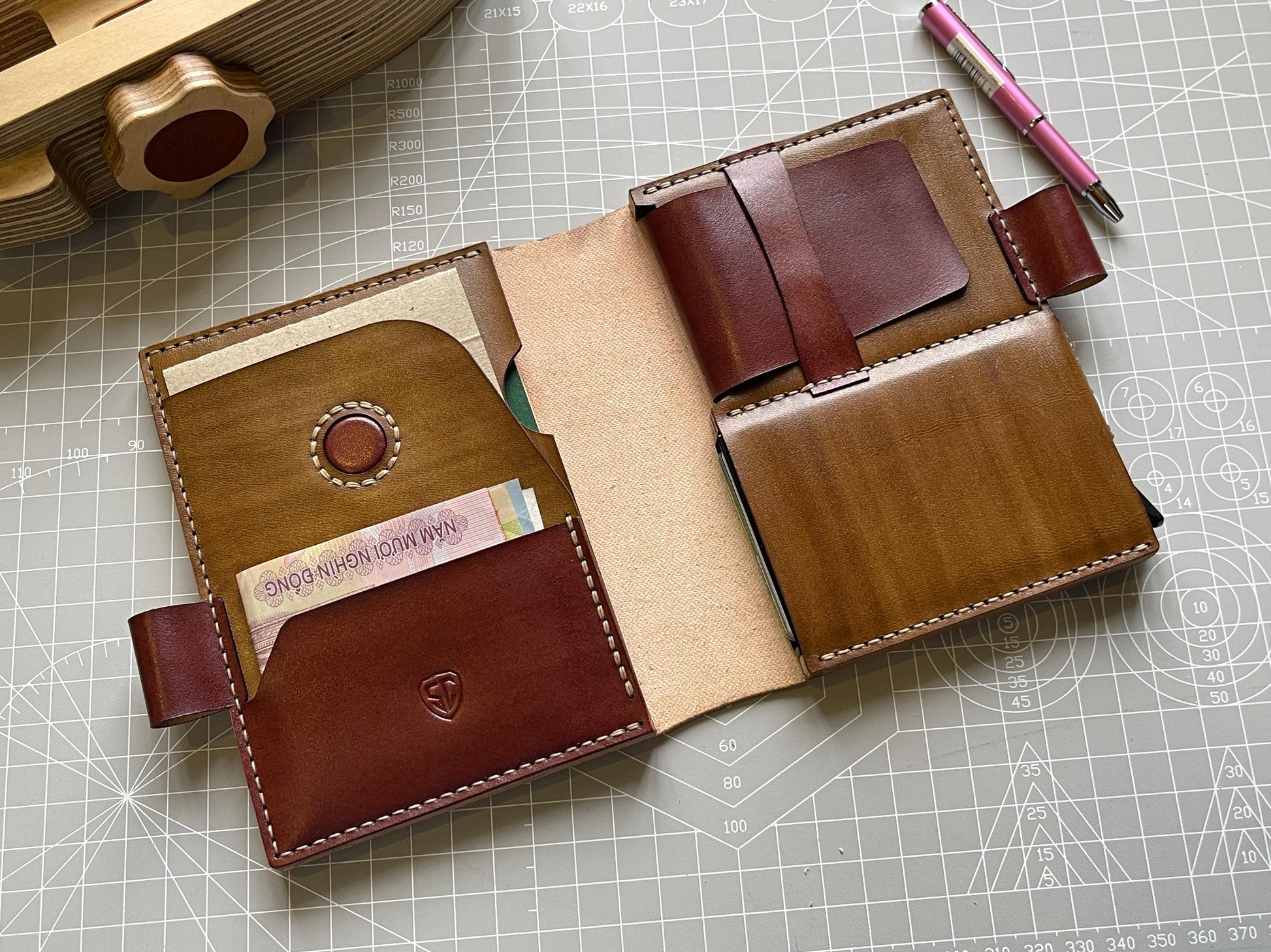 This travel wallet is designed and crafted by SCleathercraft. It will be a great companion for you when traveling around the world. It holds 1 passport, has a compartment for boarding pass/bills with magnets to keep them from falling out, has a compartment for some cash, 1 pop up card case with RFID protection, 1 compartment for coins and you can put an airtag in it too. In addition, there is a pen holder so you can carry your favorite pen. By using this wallet, you will no longer have to worry about losing important documents before flights.